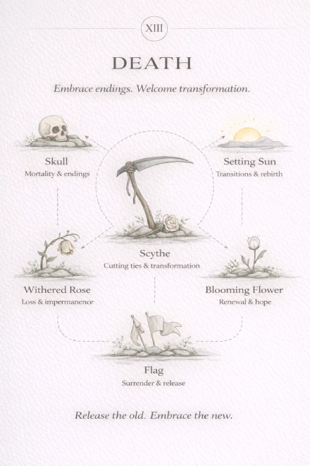 Death represents endings, transformation, and necessary change. Upright, it highlights closure and renewal through release. Reversed, it can point to resistance, delay, or fear of letting go. Its meaning depends on context and surrounding cards, showing how endings create space for new phases to begin.
