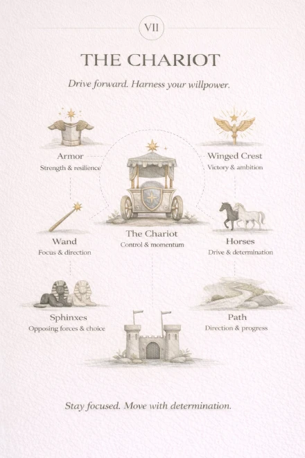 The Chariot is a Major Arcana tarot card linked to movement, effort, and control. It represents progress that comes from focus and determination. This card is about moving forward with purpose, even when the path is difficult.