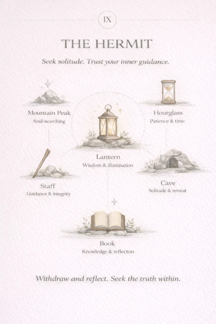The Hermit is a Major Arcana tarot card linked to reflection, solitude, and inner guidance. It represents a pause from outside noise in order to gain clarity and understanding. This card focuses on looking inward rather than seeking answers from others.