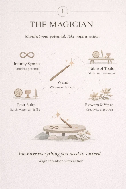 The Magician is a Major Arcana card about making things happen through skill, focus, and clear intention. It is linked to ability, planning, and using what is already available. In many decks, The Magician stands at a table with tools, showing that ideas can become real results when action follows.