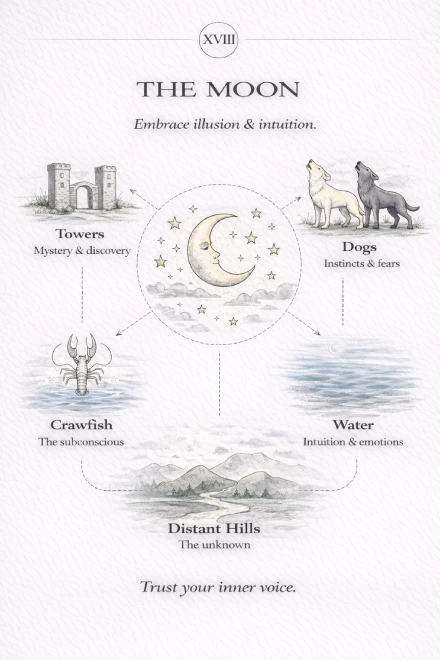 The Moon is a Major Arcana tarot card linked to uncertainty, confusion, and hidden influences. It represents times when things are unclear and when emotions affect how situations are understood. This card often appears when facts are missing or when the full truth has not yet come to light.